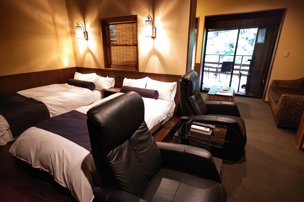 1階にある最上級の特別室「水麗」はリラックスした状態でTVを眺められるリクライニングチェアが2つ、ツインベッドと小上がりの畳スペースそして四万川を臨むテラスがあり、そのテラスから下に階段を降りるとリバービューの「露天風呂」があります。この露天風呂は源泉かけ流しなのは勿論広さにも余裕があり、開放感も文句なし。これを独り占めできる贅沢はなかなか他所では味わえないもので、部屋近くにあった貸切風呂には一度も入らなかったほど気に入ってしまいました。チェックインが14時、アウトが12時とほぼ24時間滞在できるので、時間を忘れてじっくり楽しめるのも又最高。