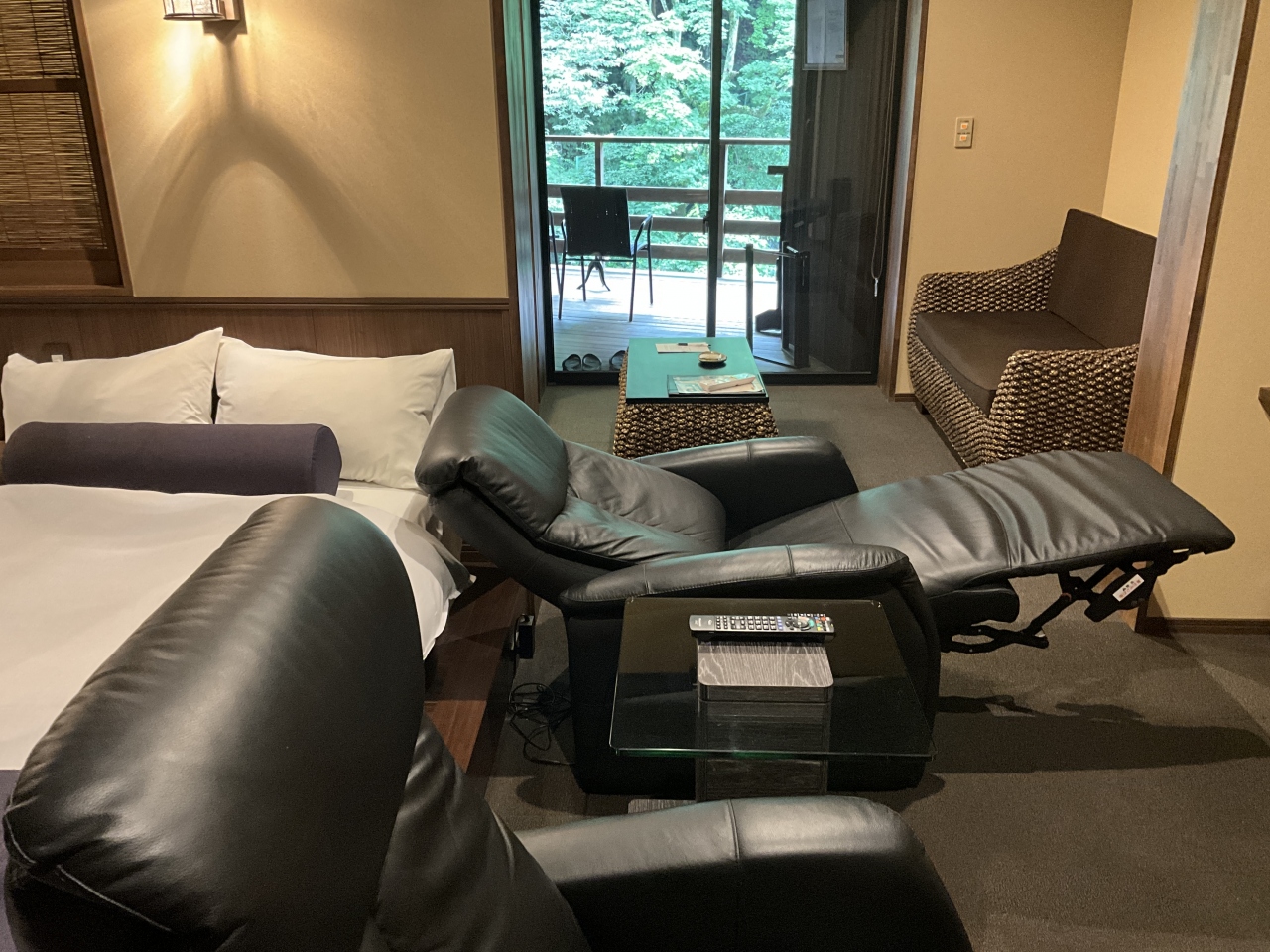 TVを楽しめるリクライニングチェア・渓流沿いの部屋露天温泉・優雅な客室…これで1人40000弱はお得です。