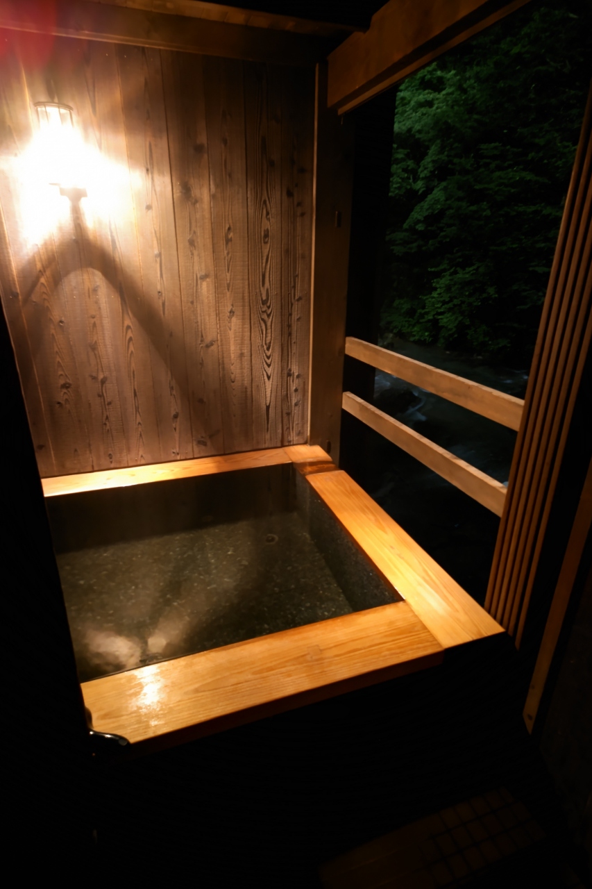 - 本館側と別館側の2箇所に大浴場があり、本館の混浴露天風呂は川沿いの素晴らしいロケーションでした。