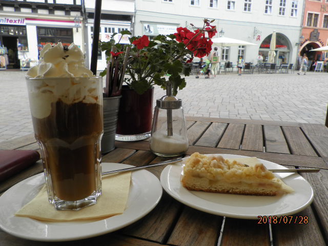 旧市街中心部、マルクト広場の老舗ホテル「テオファノ」のカフェを利用しました。ケーキが食べたかったので、店内でケーキを選び、アイスコーヒーを注文しました。コーヒーにはアイスクリームの上に甘くない生クリームがたっぷりとのっていました。テラス席で景色を楽しみながら、ゆっくりとくつろげました。