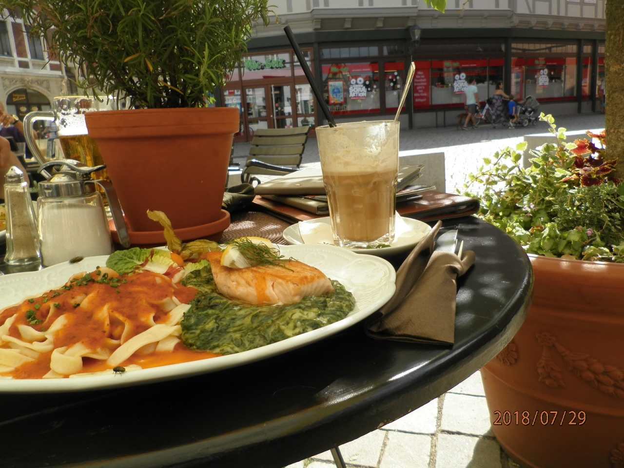 マルクト広場にある老舗ホテルのカフェで夕食を食べました。サーモンフライを注文しました。たくさんのヌードルと、ペースト状になったホウレンソウがたっぷりと盛り付けられていました。味もおいしく、テラス席で、気持ちよく食事ができました。