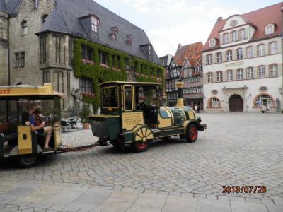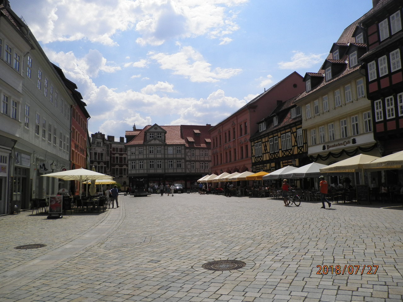 クヴェトリンブルク旧市街、マルクト広場周辺には木組みの家が残る美しい町並みがあります。マルクト広場には、旧市庁舎やその横にはローラント像、のんびりと街の景色を楽しみながらカフェのテラスでお茶をのんで、ゆっくりとした時間を過ごせます。城山からの町の眺めの素晴らしいです。