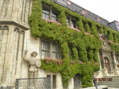 クヴェトリンブルクのマルクト広場にある市庁舎です。石造りの市庁舎で、窓辺に咲いている花と緑の蔦が印象的です。正面の左には、町の自由と公正を象徴しているといわれる石の素朴なローラント像が立っていました。残念ながら、中に入ることはできませんでした。