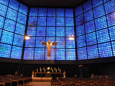 戦争で爆撃を受けて、破壊されたままの塔が戦争の悲惨さを伝えています。隣にはガラスブロックの礼拝堂があり、内部は、青い光が印象的で、とても厳かな気分になりました。周辺は、色々な出店があり、にぎやかで、教会とは全く違う雰囲気になっています。