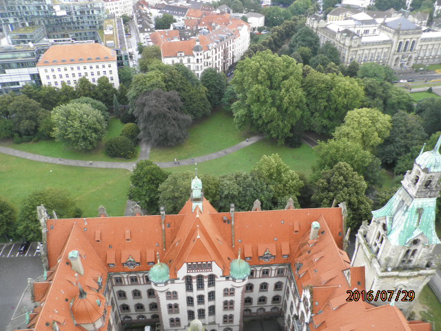 この市庁舎は外観もとても素晴らしいのですが、丸屋根に上るエレベーターが珍しいものです。普通に上にあがるのではなく、丸屋根の傾斜にそって斜めになり上がっていきます。もちろん、上から見える景色もすばらしいです。マッシュ湖やハノーファー市街が一望できます。