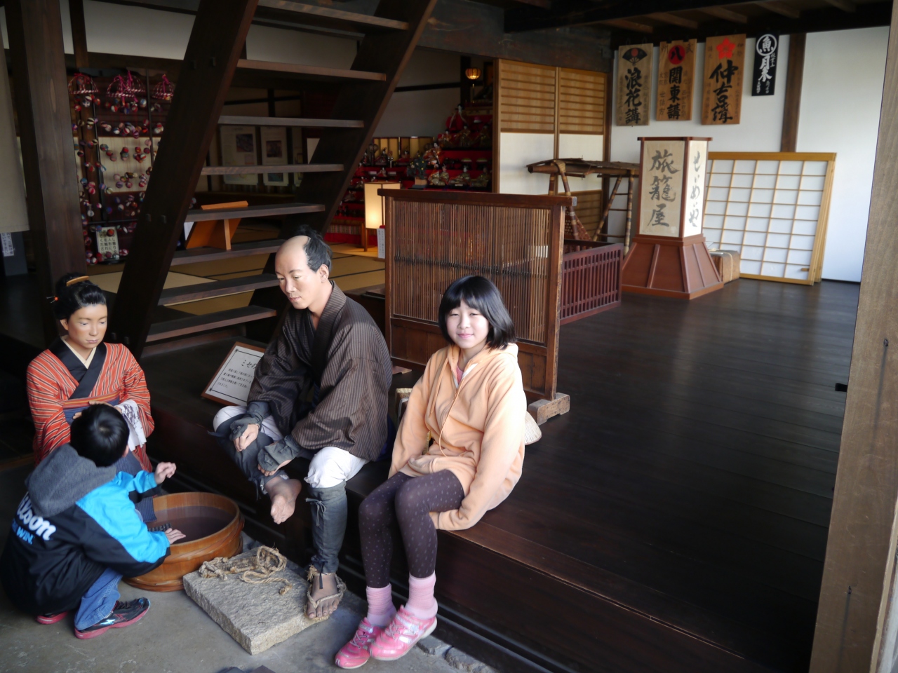二川宿本陣ということで、お殿様が滞在するスペースでは、お庭を眺めゆっくりしている人もいました。縁側?で日向ぼっこ。梅もきれいでした。- 旅行時期