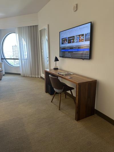 部屋の奥のソファとテーブルとは別にテレビの下にもデスクがあります。テレ...