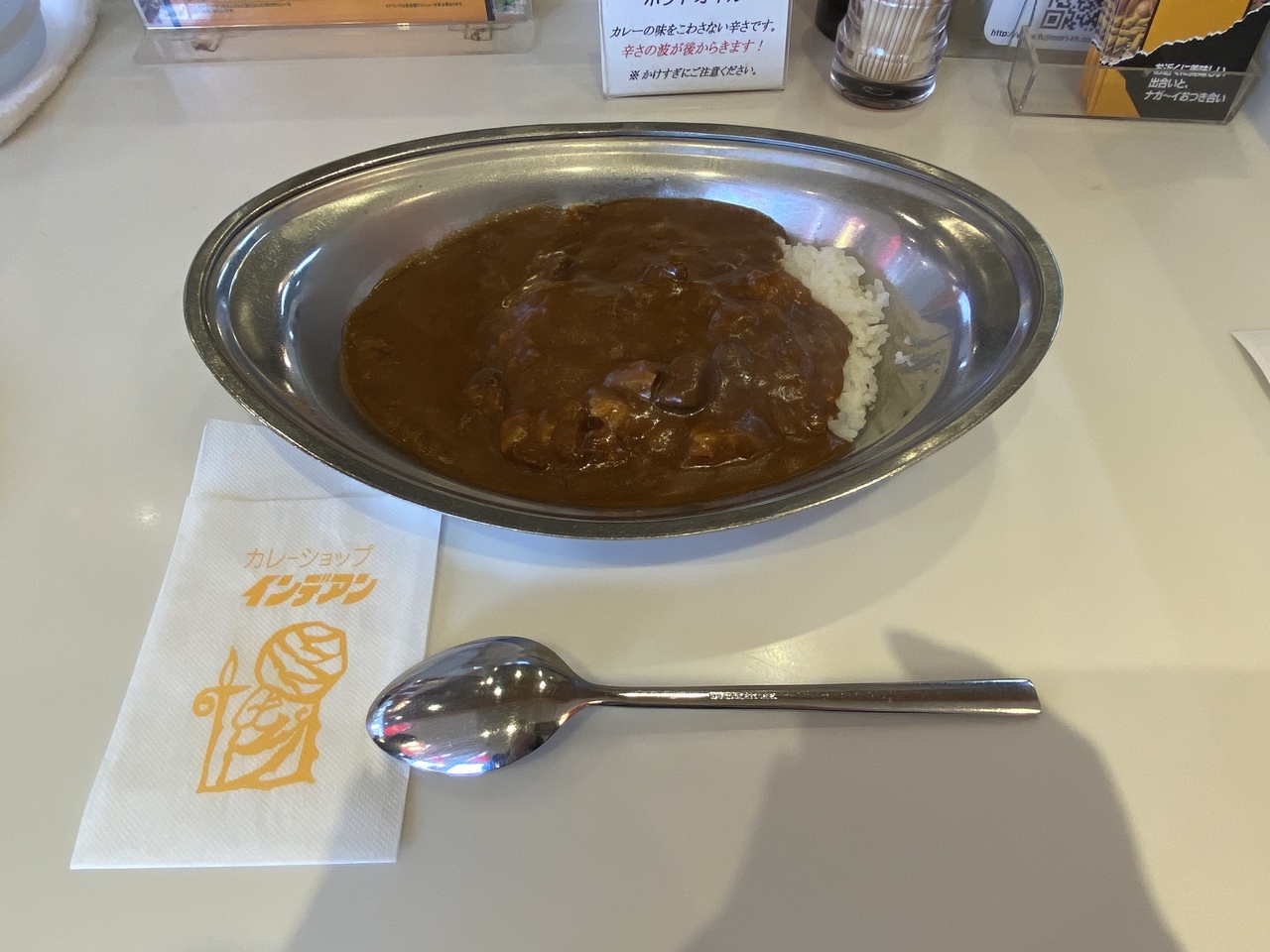 カレーライスが好きではない私も2回食べました。1回目は移動があったので持ち帰り。レンジで温め直しでいただきましたがおいしかったです。ご飯の量が多いのをしらず食べきれない量でした。辛さも量も選べて、これがワンコイン前後で食べられるのは素晴らしいなと思います。