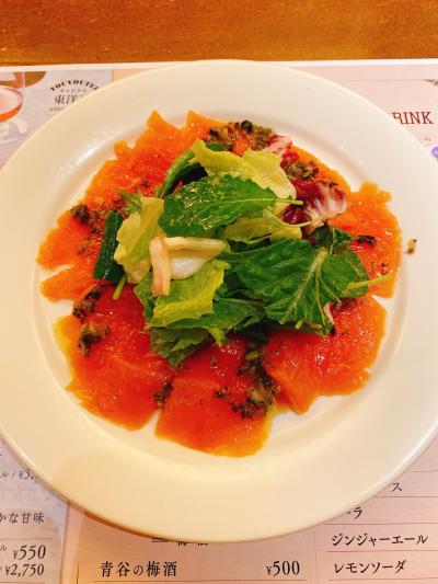オードブルはサーモンマリネサラダにしました。とても肉厚で大きくて美味しかったです。これだけでお腹が満たされそう。最初はビールにしたけど早くワインが飲みたい。