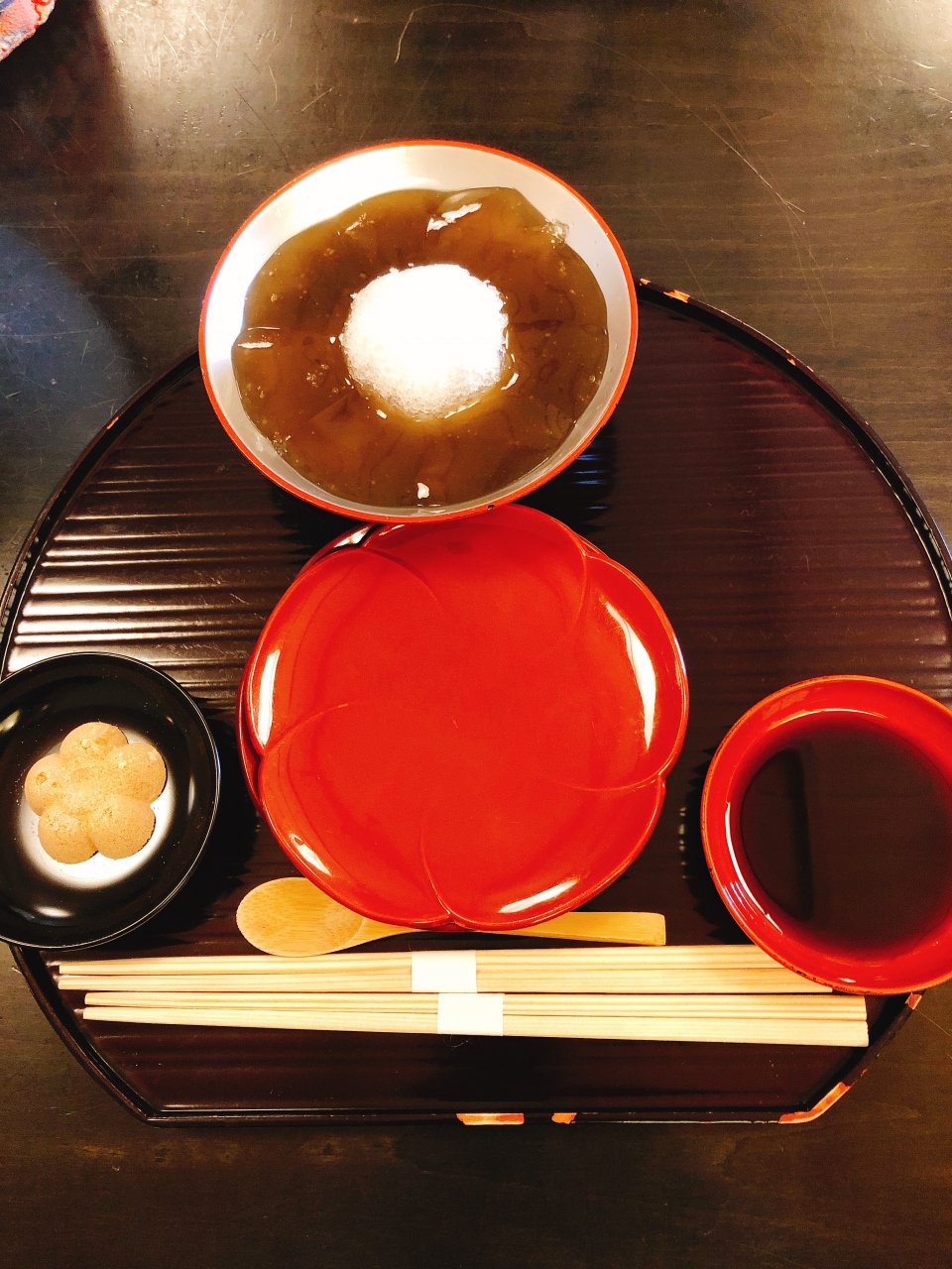 わらび餅は、てゅるんてゅるん、もちもち、箸で持ち上げるのが面白い。