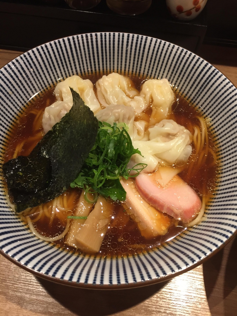 ラーメン屋さんで、メニューを見るとワンタン麺があり、2,3組の列。