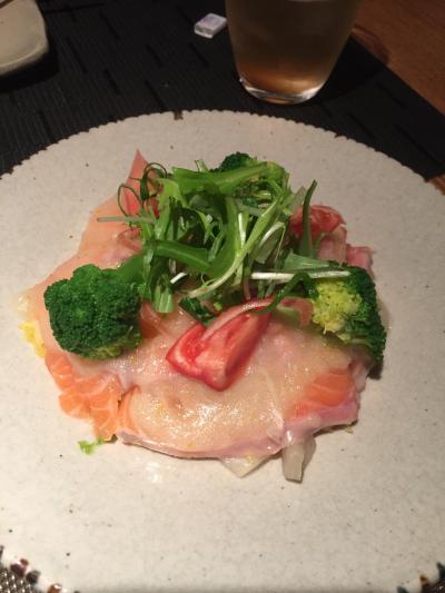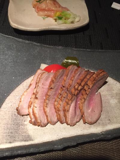 野菜サラダ、サーモンカルパッチョ、豚の白味噌煮、鴨の燻製ロースト