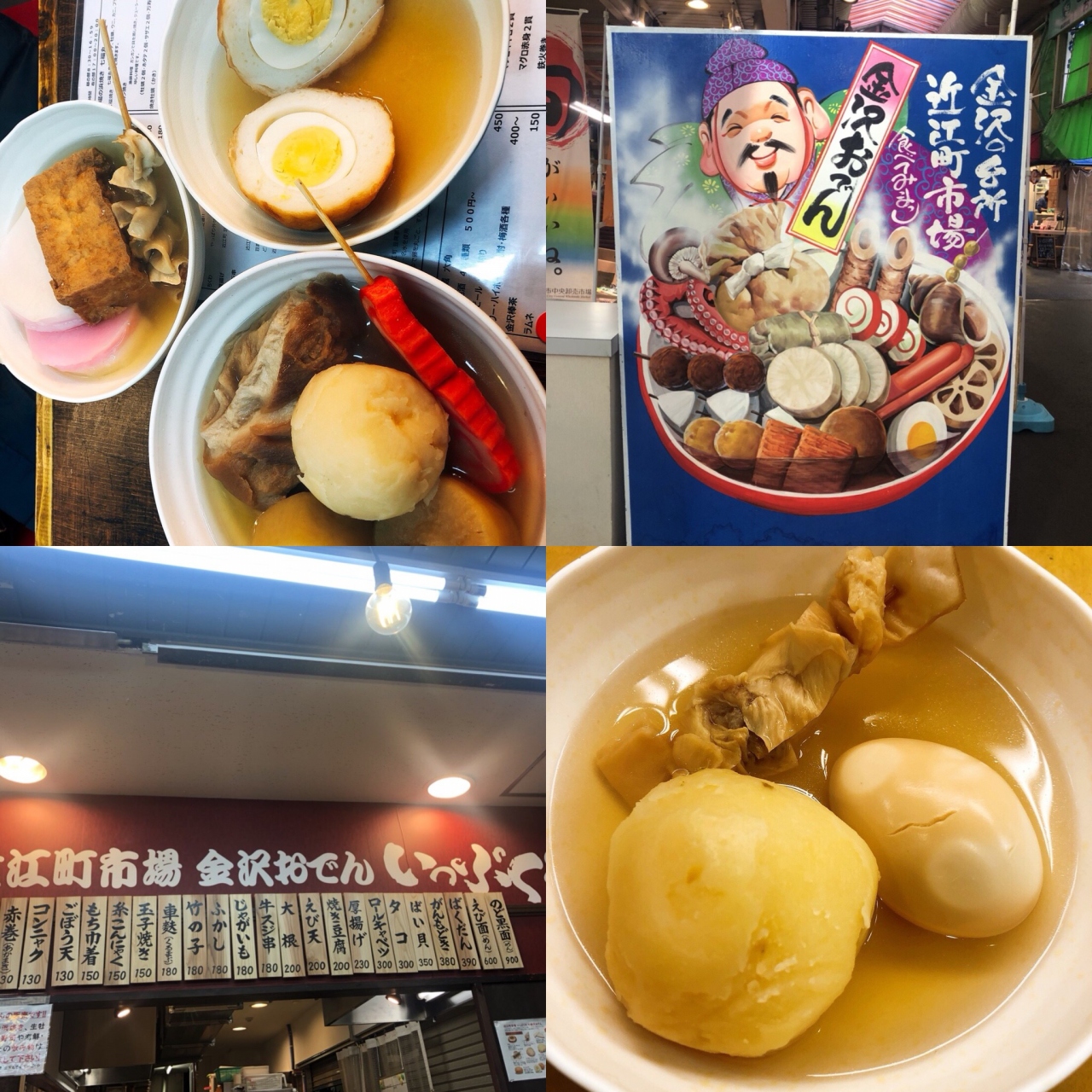 近江町市場にある金沢おでんのお店。気軽に立ち寄れる感じです。食べたいものを食べたいだけ注文すればいいし。