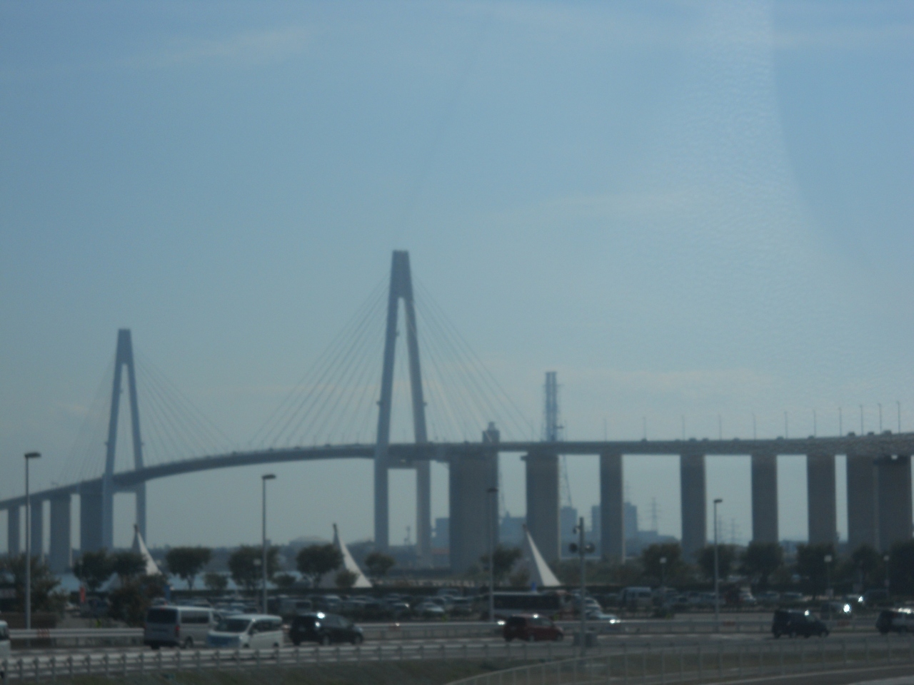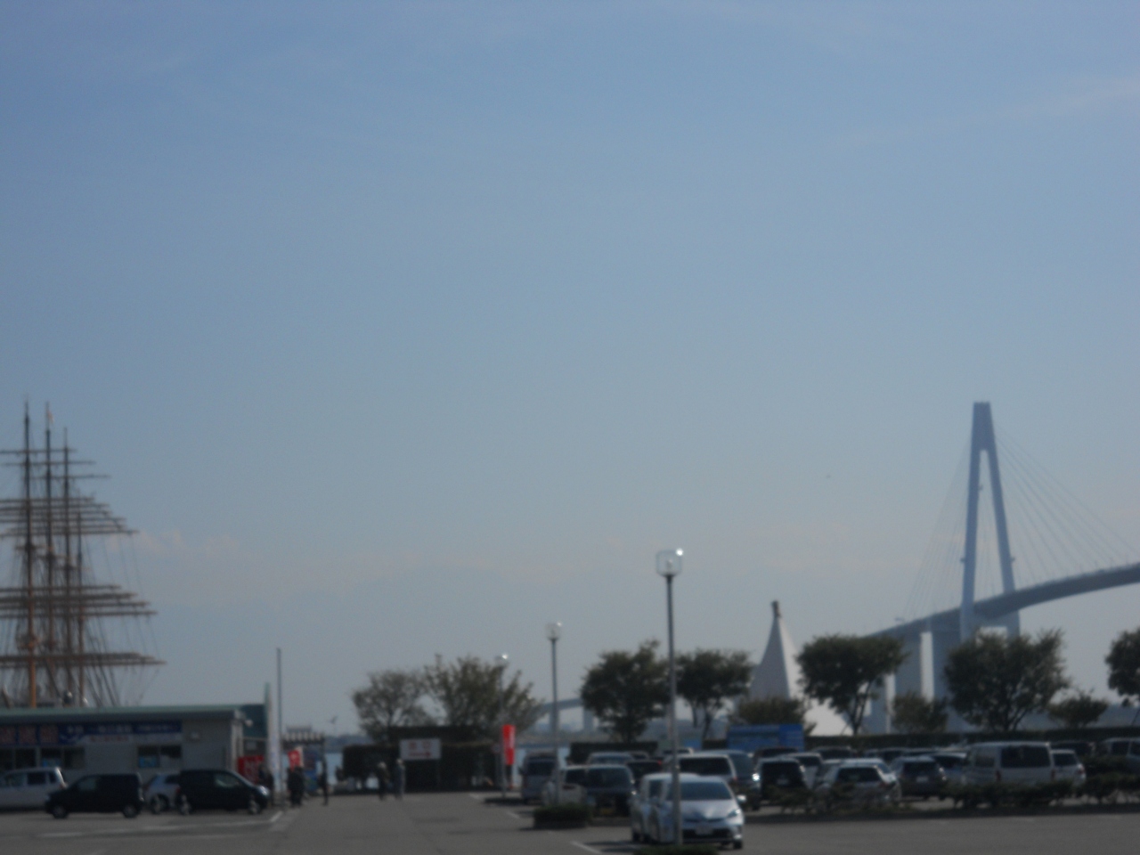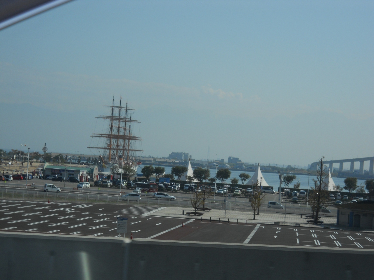 橋は高架になっていて、左手に工場、右手には海と海王丸が見える絶景!