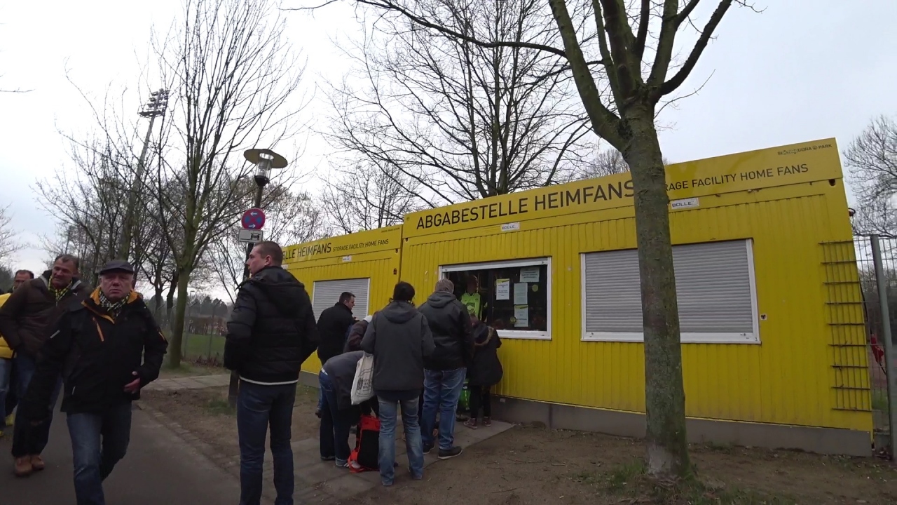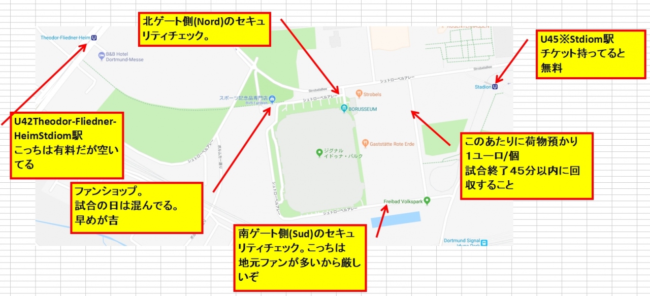 カバン類は、Stadum駅からでてスタジアムの途中に黄色いコンテナBOXがあるので、