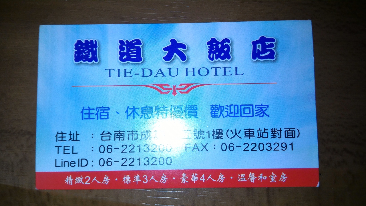 台南駅を出ると、正面右手に「鉄道飯店(tei dao hotel)」の赤い看板があります。