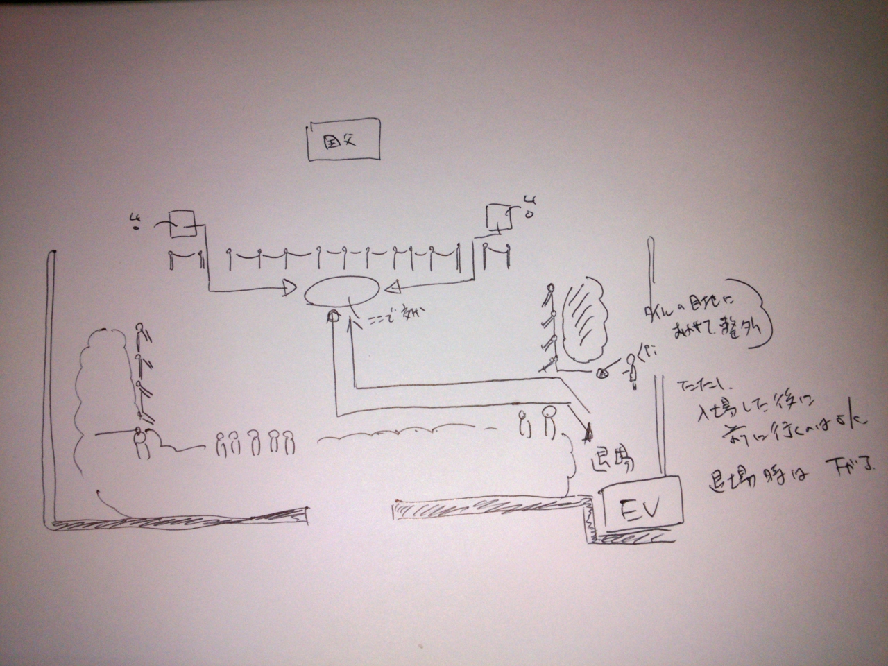 入って正面右側奥(エレベータ側)から入場してきますので、