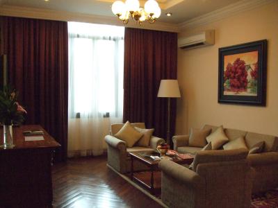 部屋はドンコイ通り側のスイートで、リビングとベッドルームの二部屋にバスルームでした。部屋自体はそれほど広くないですが、天井が高かったので気になりませんでした。全体的にウッド調で落ち着いた部屋なので、夜などゆっくり部屋でお酒を飲んだりできてよかったです。ただ、バスルームのバスタブが使いにくく、シャワーカーテンをしても水が床に漏れてしまいました。蛇口もバスタブも昔のものなので仕方ないですが、水しぶきが跳ねないように気を使いながらのシャワーは少し大変でした。