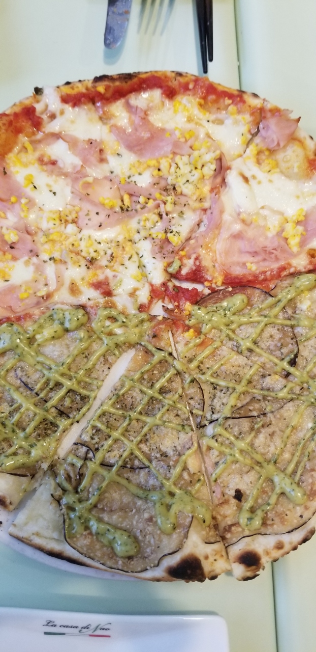 米ナスのピザはバジルソースがかかっていて、あっさりめでおいしかった。