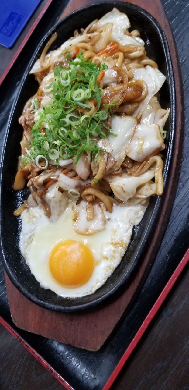 熱々鉄板皿に、ソース味の焼きうどんに目玉焼きがついています。