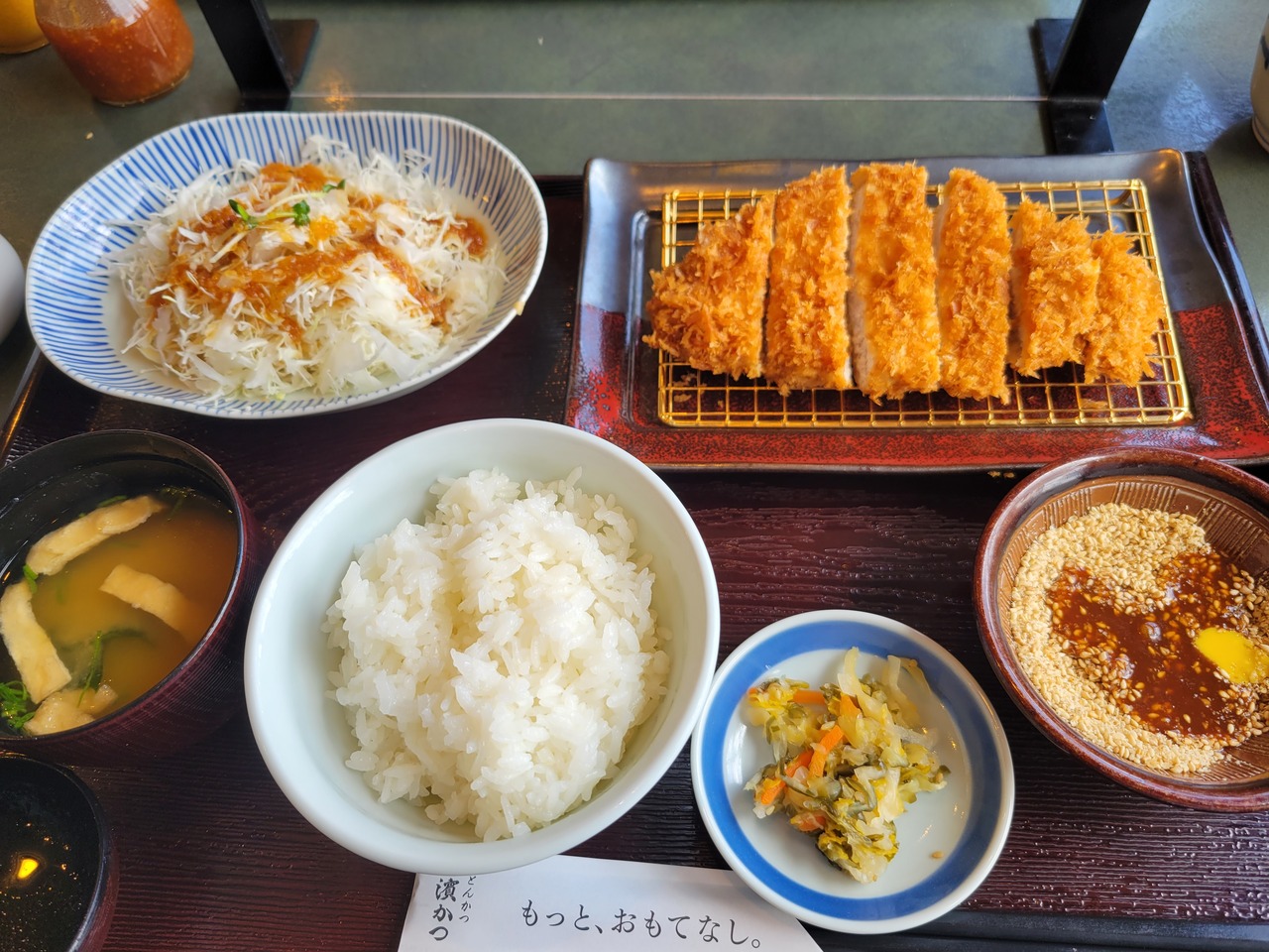 ロースカツは肉厚で、ジューシーでした。キャベツの千切りと漬物は、おかわりできます。ドレッシングも二種類あり、爽やかな味です。