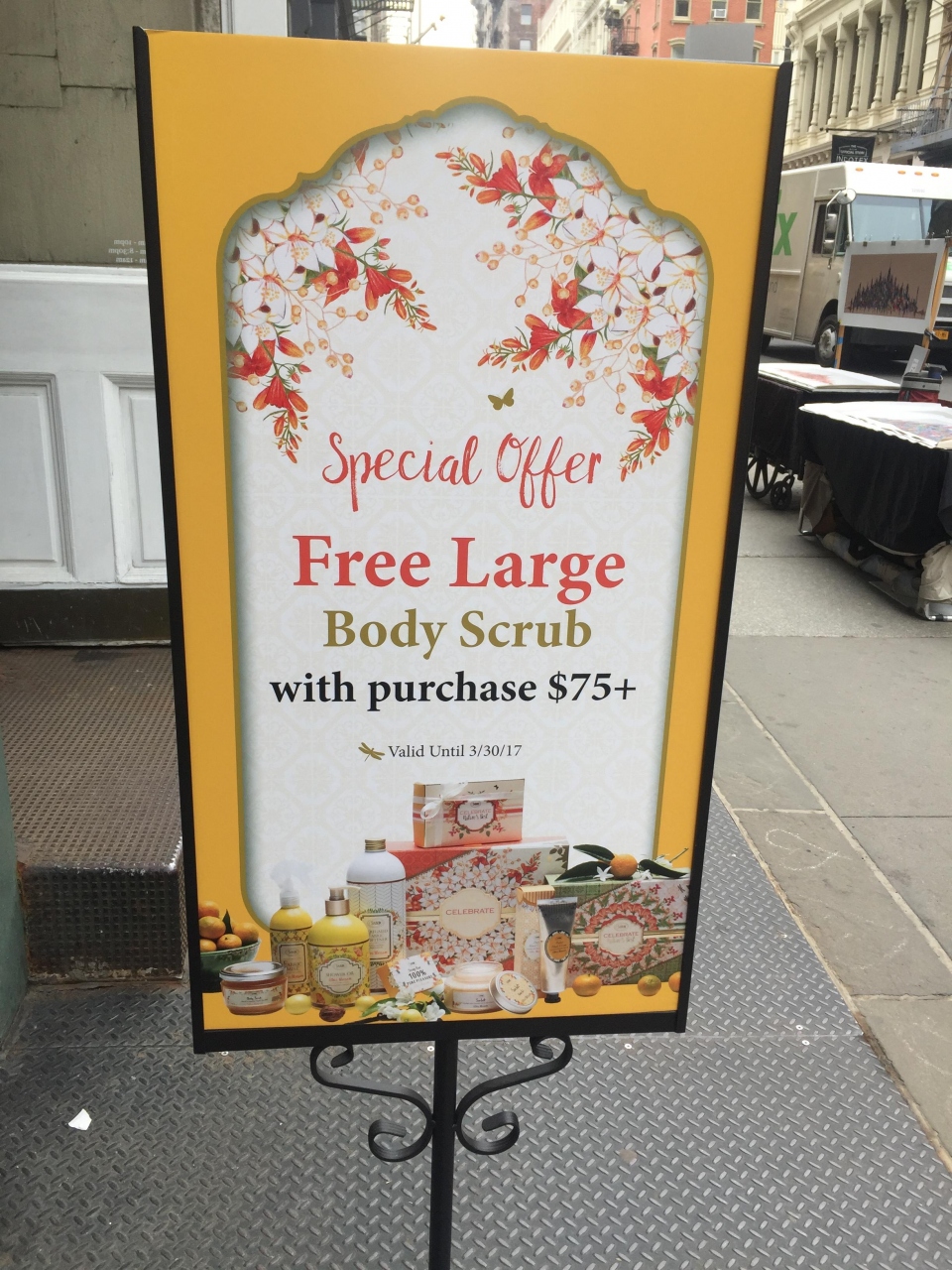 $75以上で、ラージサイズのボディスクラブサービススペシャルオファー が開催されてました。