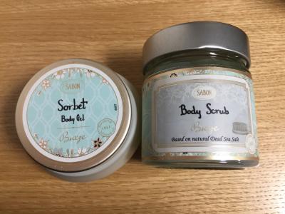スモールサイズボディスクラブとボディジェル(日本未発売)、春から初夏に向いている心地よい香り。