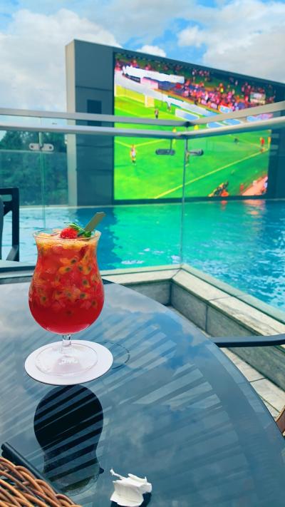 昼間はプールサイドでカクテルをもらったり、夜は夜景とプールサイドに出現する大型スクリーンでサッカーを放送しています。