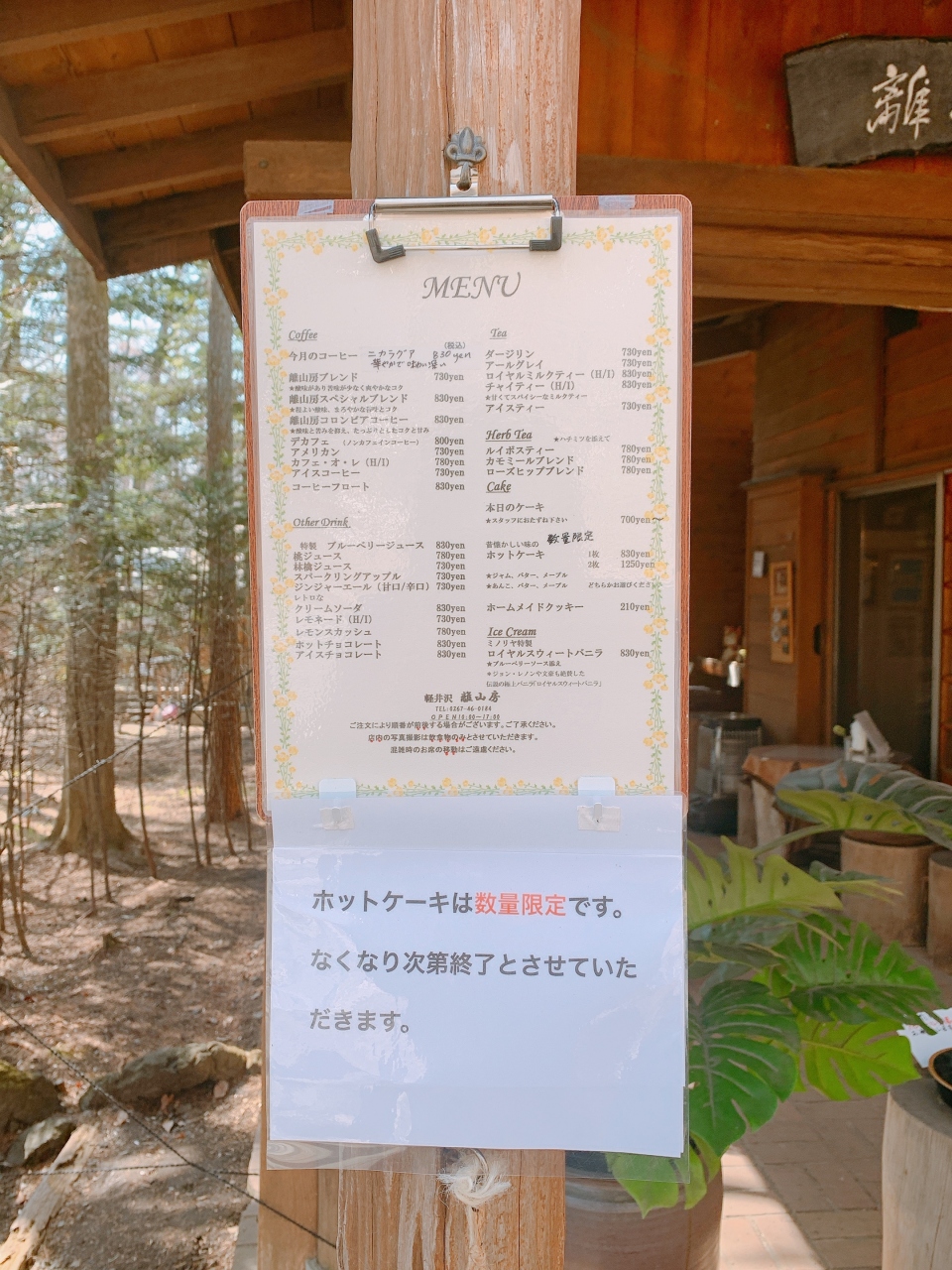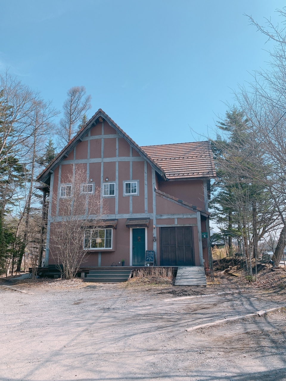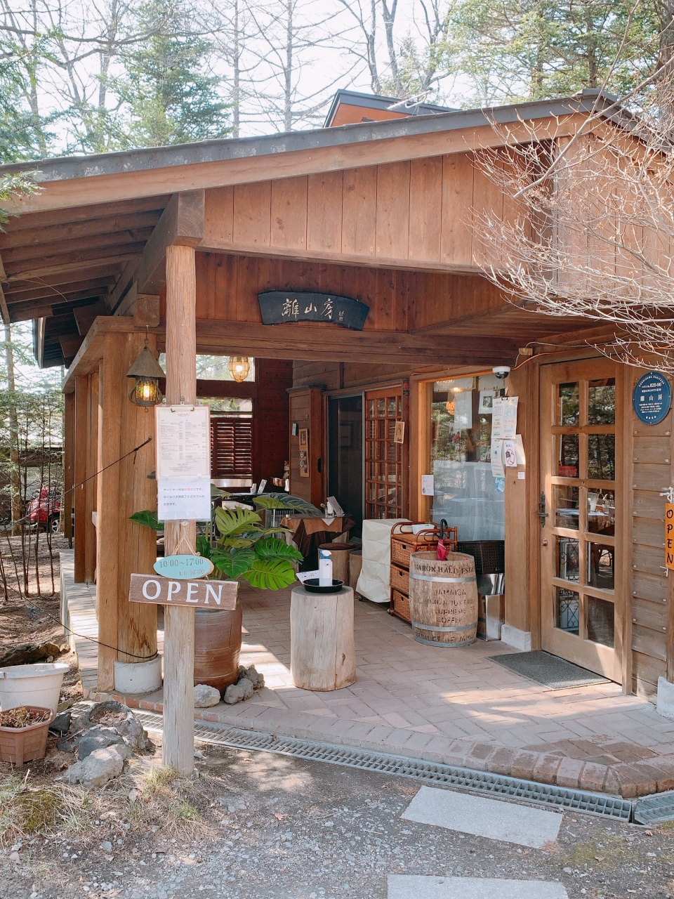 ゆとりろ軽井沢ホテルの一件隣に建設会社の建物があり、日の出学園軽井沢山荘の白い看板が立っている砂利道を2、3分ほど進んだ左手に小屋が建っています。