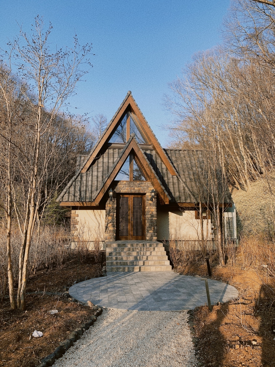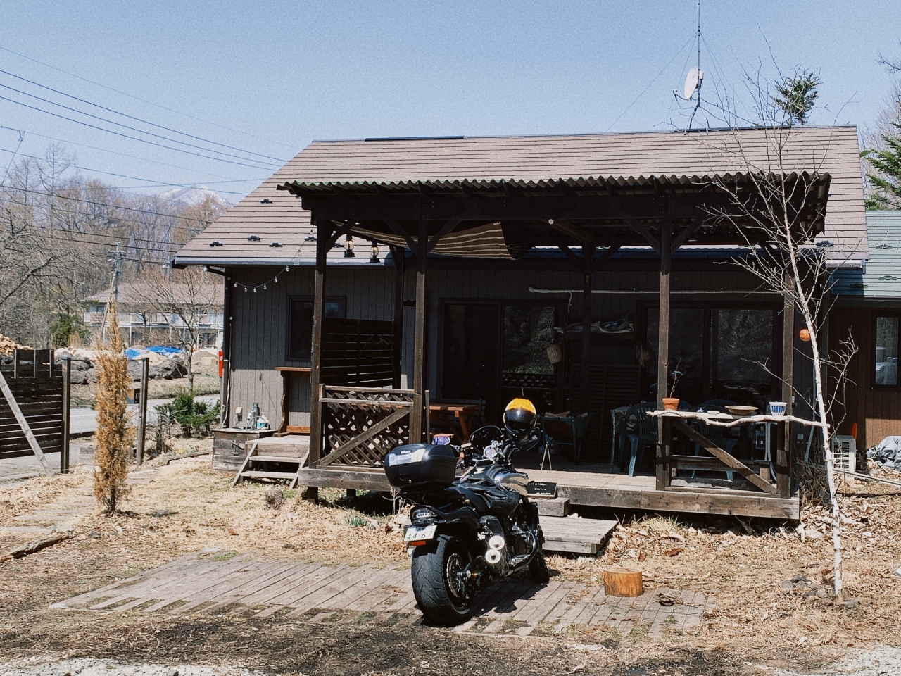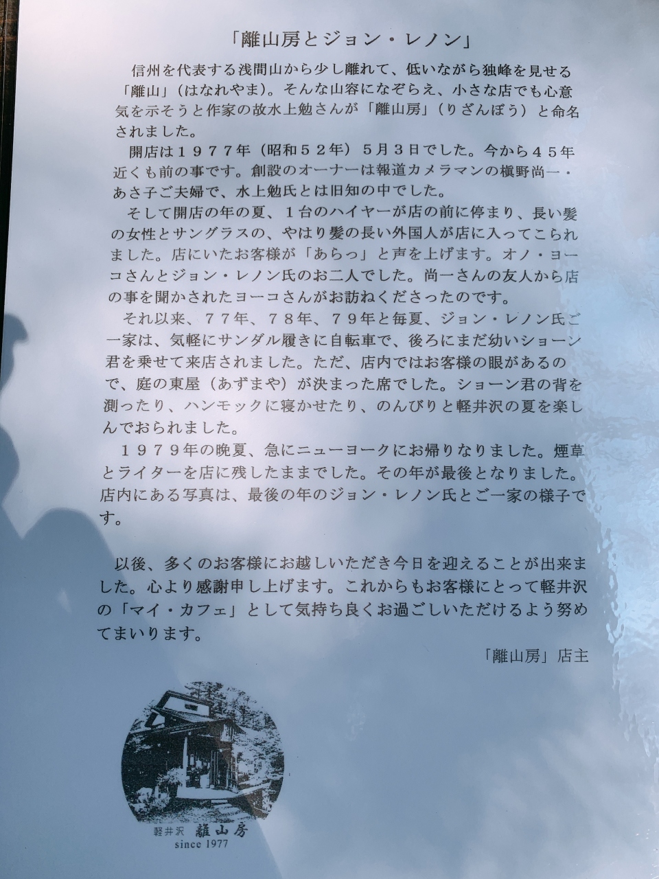 ゆとりろ軽井沢ホテルの一件隣に建設会社の建物があり、日の出学園軽井沢山荘の白い看板が立っている砂利道を2、3分ほど進んだ左手に小屋が建っています。