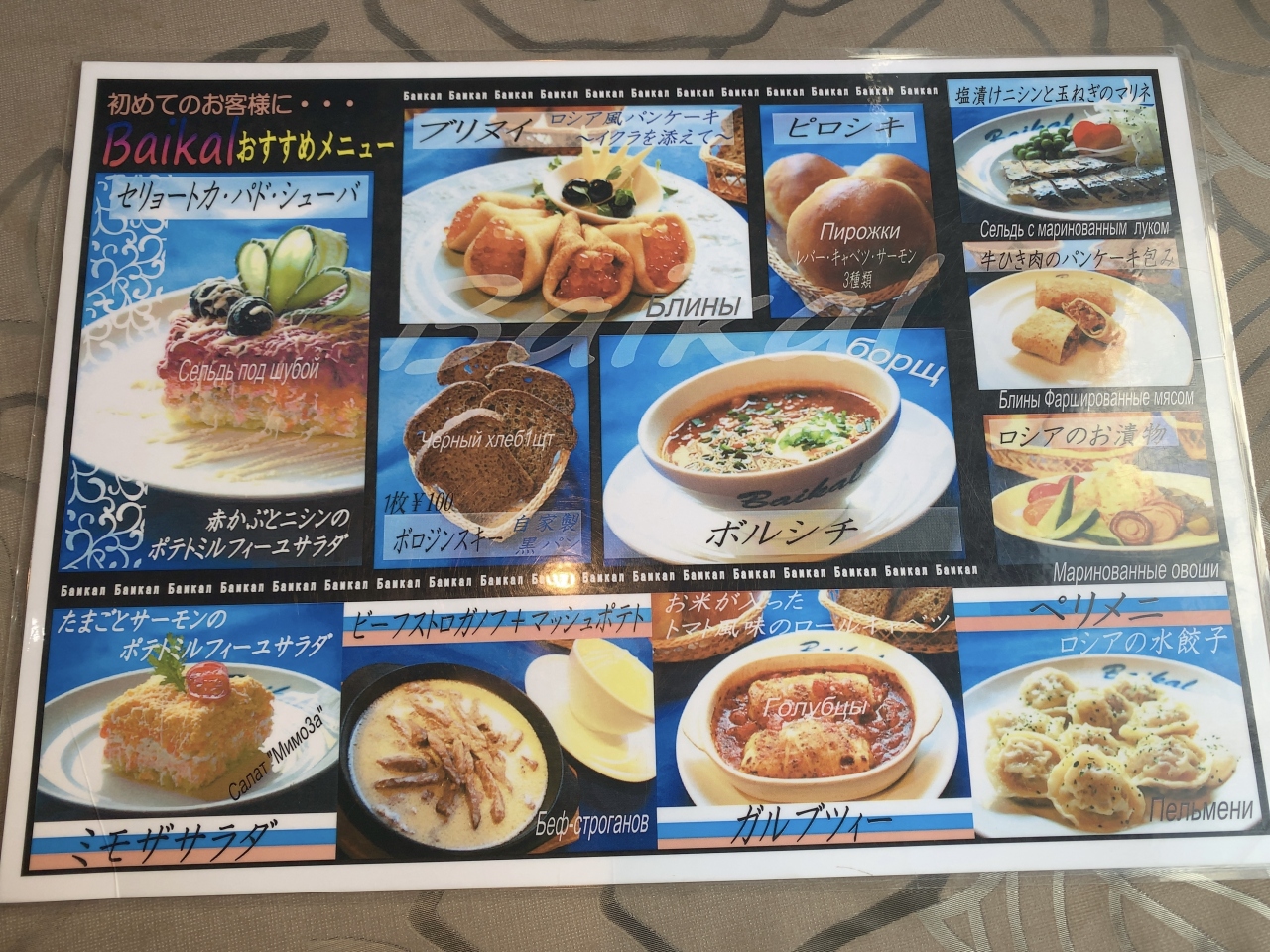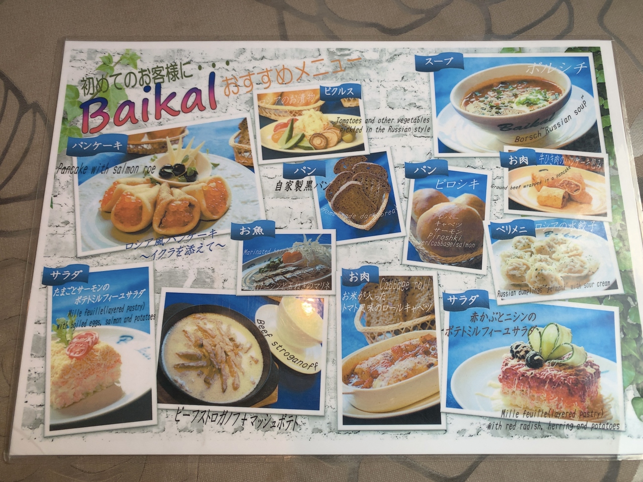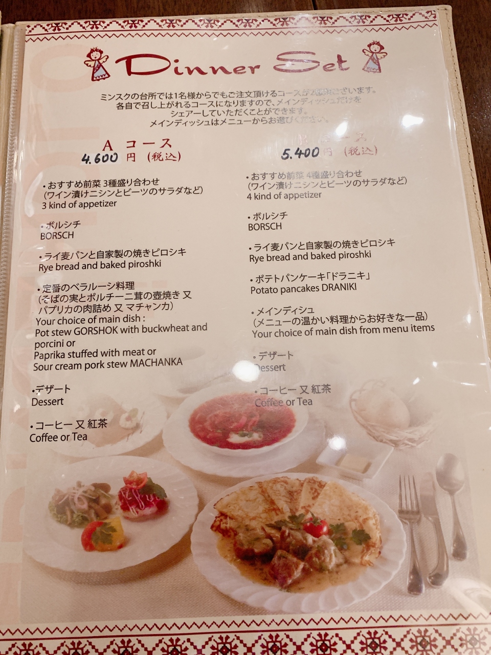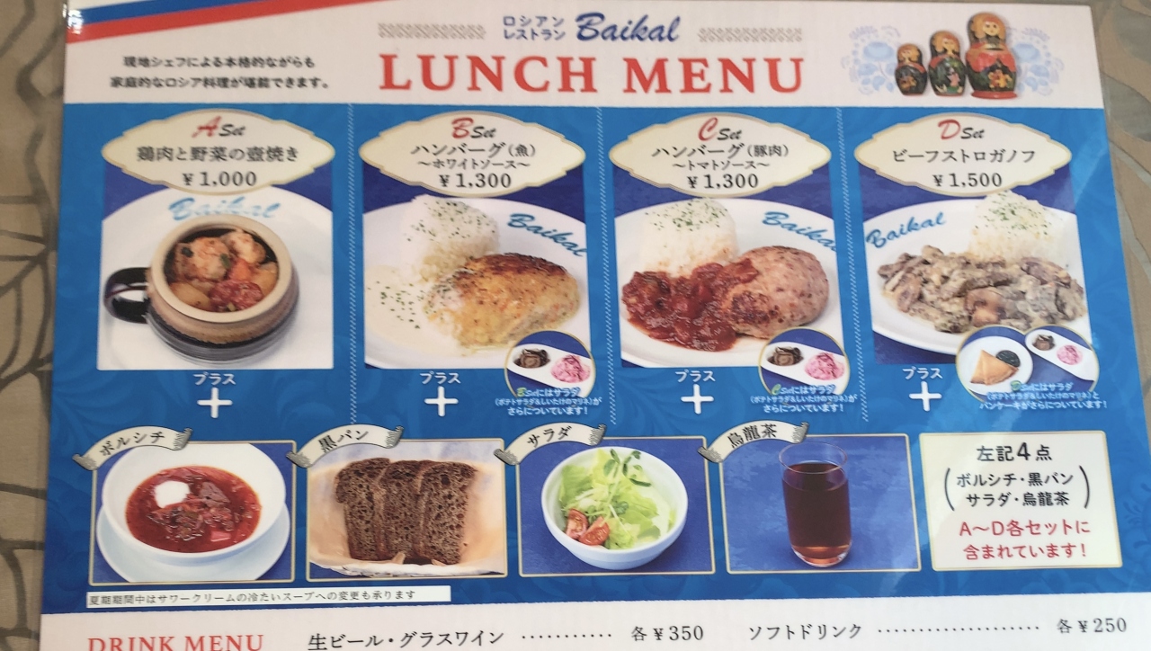 ベラルーシ料理は馴染みがありませんが、ボルシチやピロシキなど聞いたことがあるロシア料理のメニューがあります。