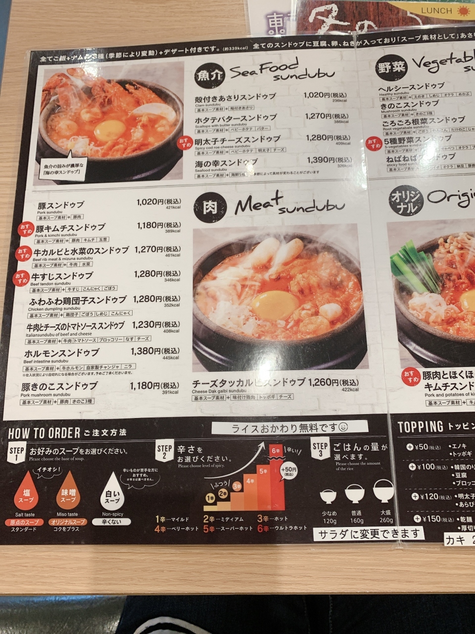 メニューのスンドゥブは魚介、お肉、野菜やオリジナルと種類豊富で辛さを選ぶことができます