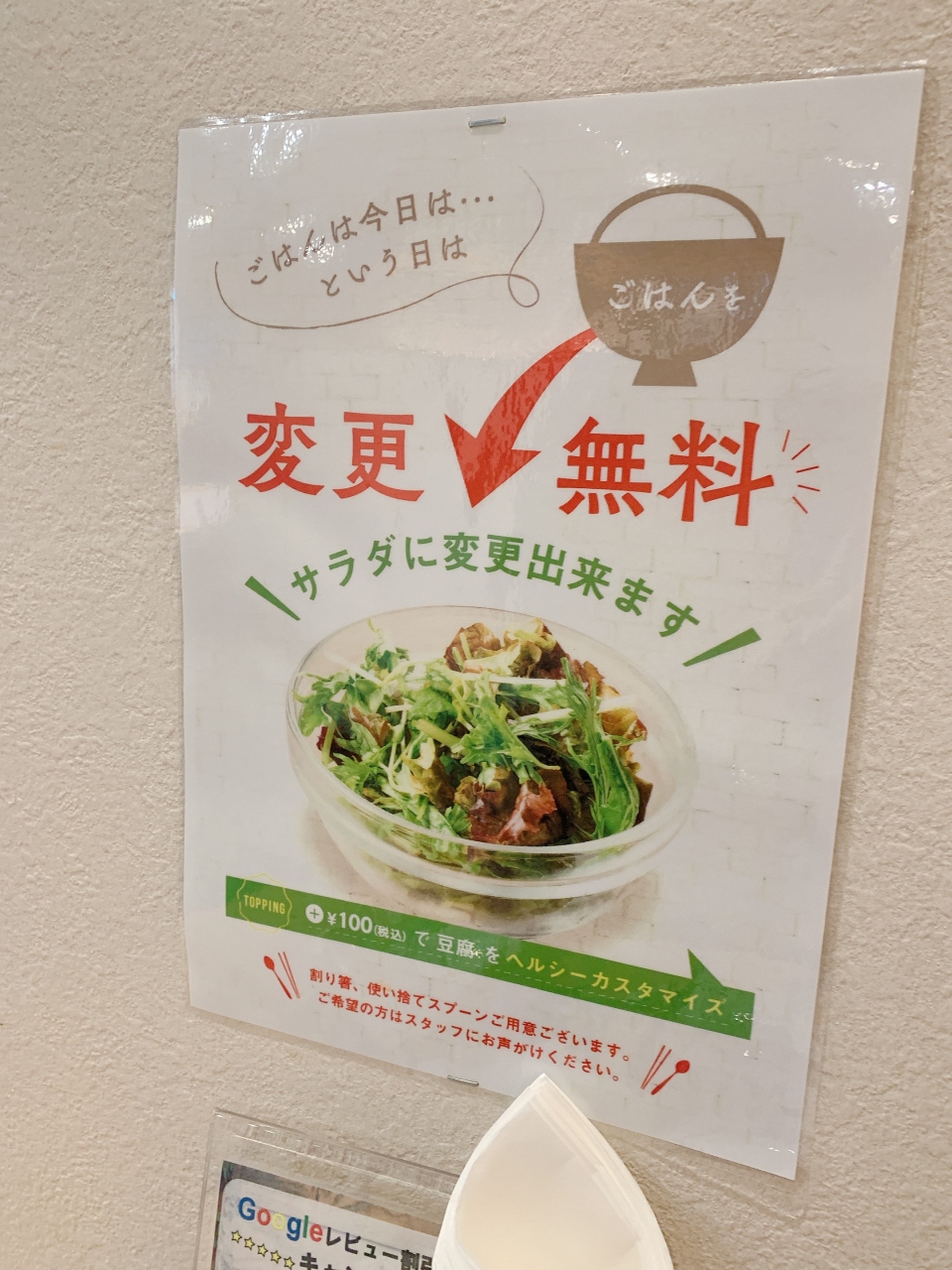 またセットの白米を無料でサラダに変更できたり、トッピングを追加できます。