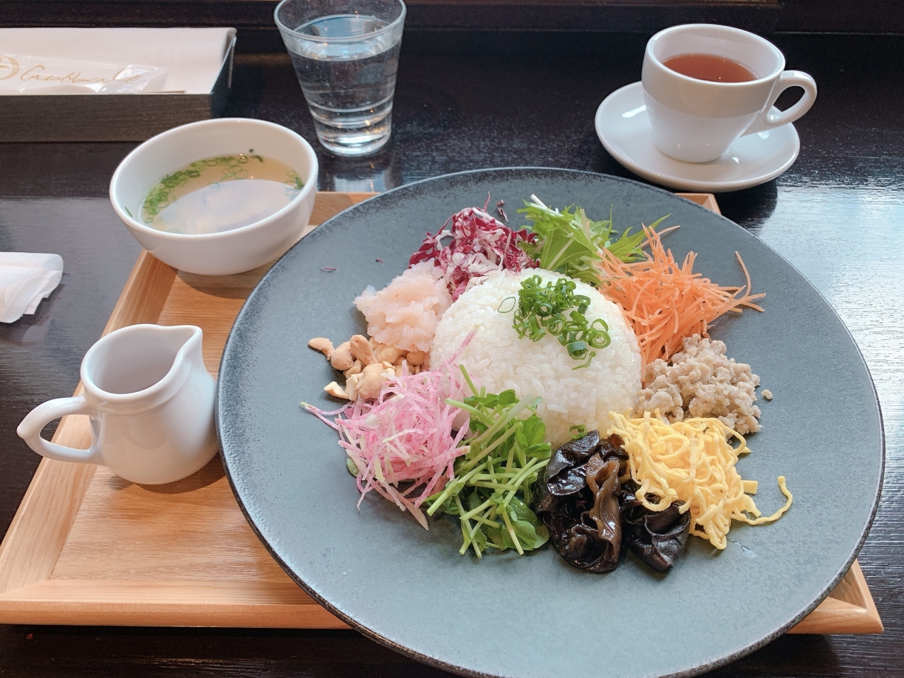 プレートにのせられたご飯、サラダ、チキンなどを混ぜてスープをかけて食べるスープカレーも美味しかったです