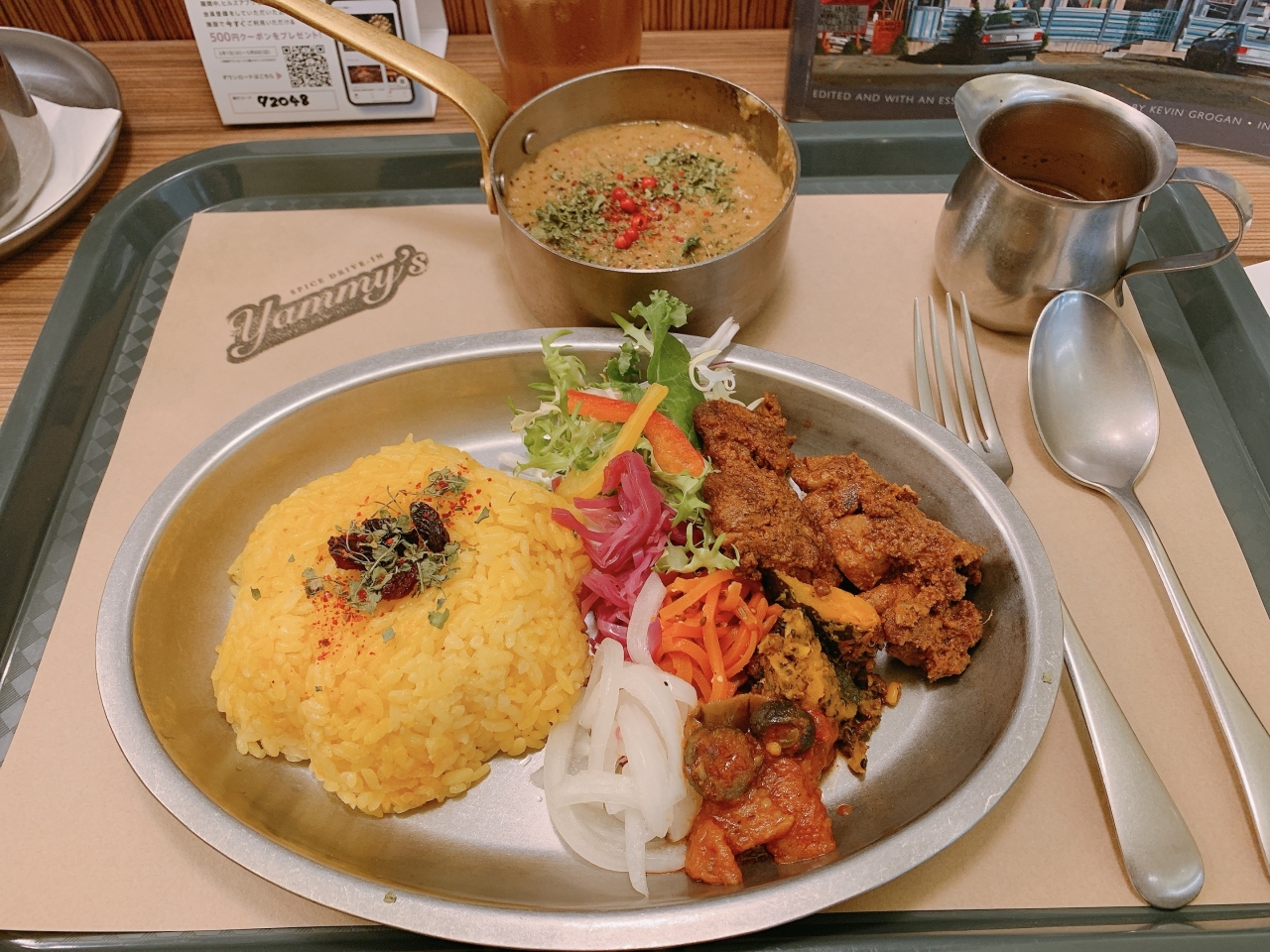 今回注文したデビルチキンカレー1,300円はボリュームがあり、色々な味の副菜が添えられていて美味しかったです。ココナッツベースでクセになる美味しさでした。