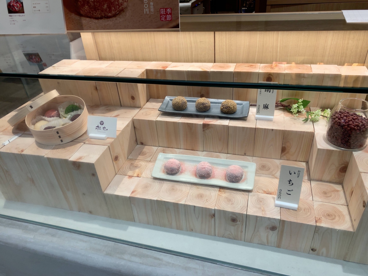 色とりどりのおはぎとあんみつがガラスケースに並び美味しそうです