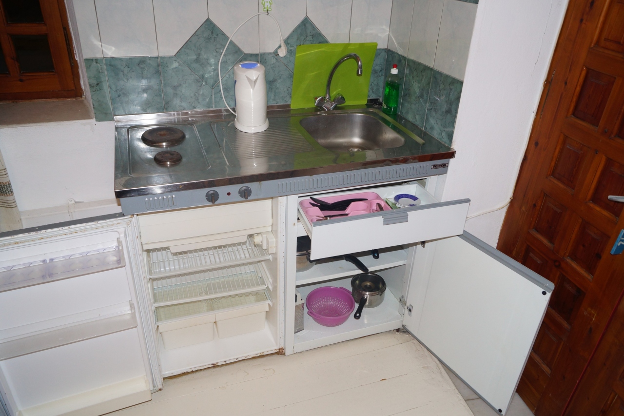 冷蔵庫・コンロ・ポット・鍋・フライパン・ざる・栓抜き・皿・カップ・コップ・塩・コショウ・油 etc