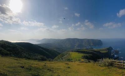景色自体はよかったのですが、国賀海岸へ下っていく道中と、摩天崖の駐車場入口にある、牛馬が外へ出ていかないように設置された溝「テキサスゲート」のところで、写真のように牛さんに通せんぼを食らいました。クラクションを鳴らしても、慣れたものなのかマイペースというのか、なかなかどいてくれずに10分くらい立ち往生しました(苦笑)。こればかりはある程度、牛さんのご機嫌を待つしかないのかな。テキサスゲートでは、牛さんも勉強しているのか、道路側から出ずに脇の草むらから道路にほいと出て、テキサスゲートにたまっていた水を飲んでいました。