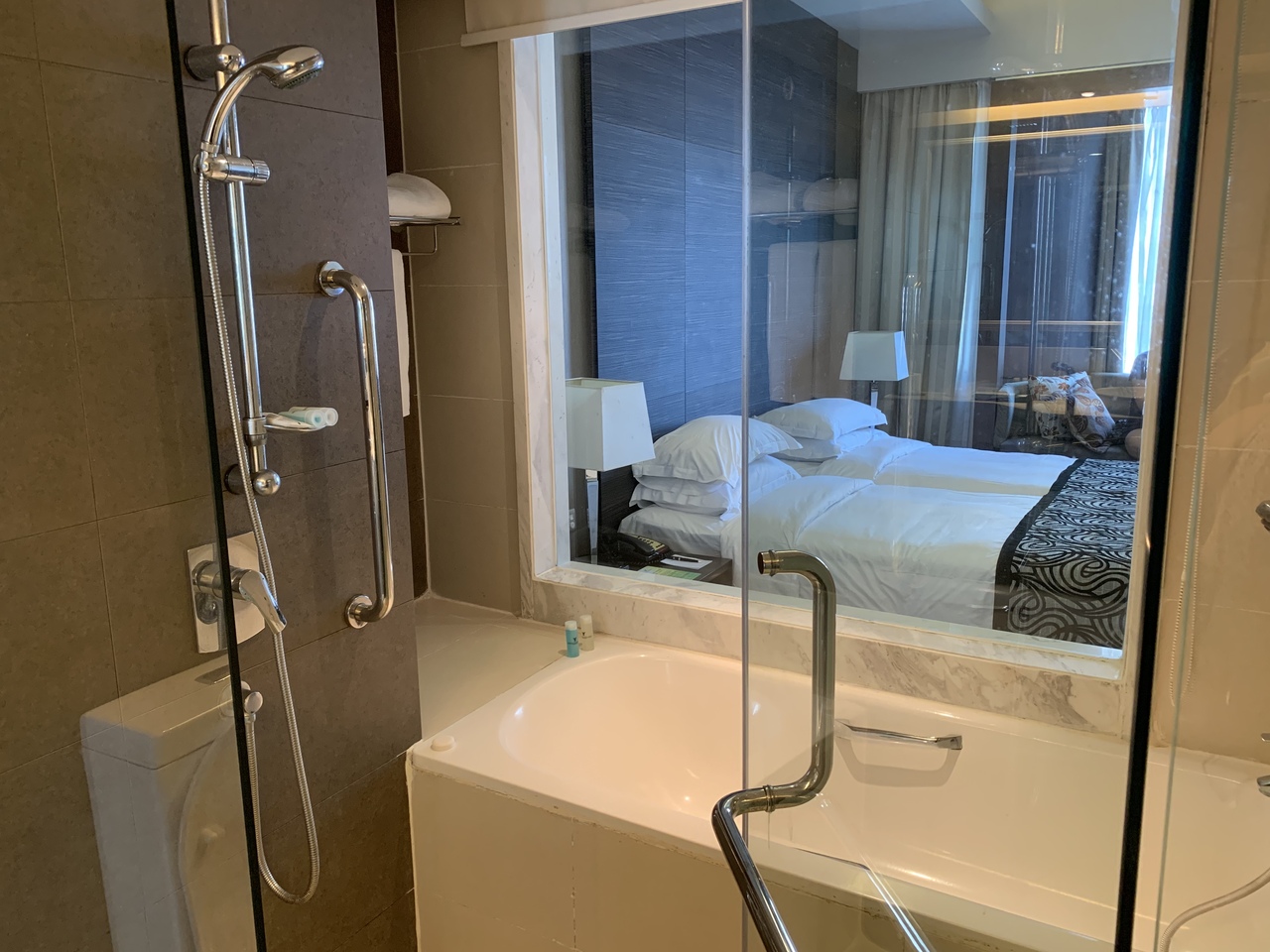 バスルームは奥にバスタブ、手前にシャワースペースがあり、シャワーはバスタブとシャワースペースの2か所にありましたし、シャワースペースの所にガラス戸があったので、トイレの方への水ハネなども気にすることなく使い勝手が良かったです。