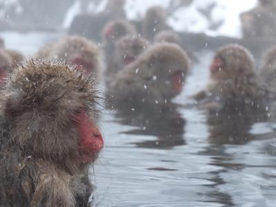 雪深い山の中を30分歩いて目的地の地獄谷公苑に着きます。寒くて歩きにくい道ですが、行く価値はあります。公苑には予想以上に猿がいて、びっくりしました。触ってはいけないですが、子猿が背中に乗ってきたりすることもあります。観光客も多く、カメラを構えて動かない人もいるので、うまくポジションを確保することをオススメします。