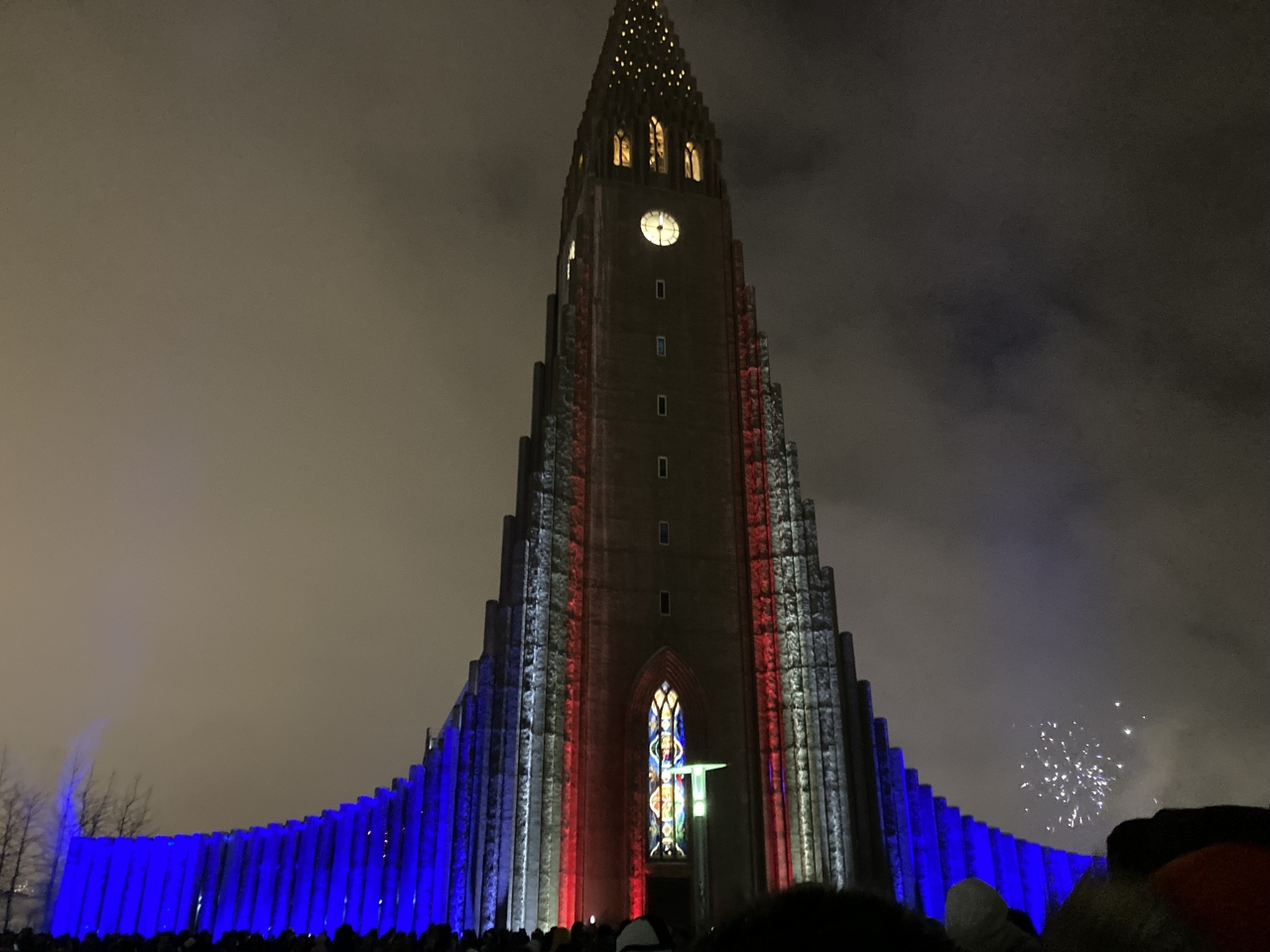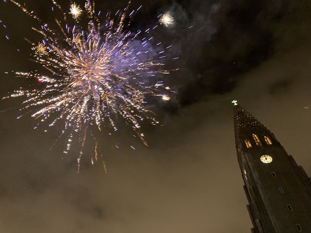 大晦日の夜から新年を迎える時にレイキャビクでは花火が上がります。教会前の広場でも同様で、花火の火花と煙で異様な盛り上がり。日本の花火大会のような花火ではなく、家庭で行う花火がもう少し打つ上げ花火になっているイメージ。ただ個人で上げており、安全性は疑問。火の粉は普通に降ってきます。0時を迎えると教会はアイスランドカラーにライトアップ。きれいです。
