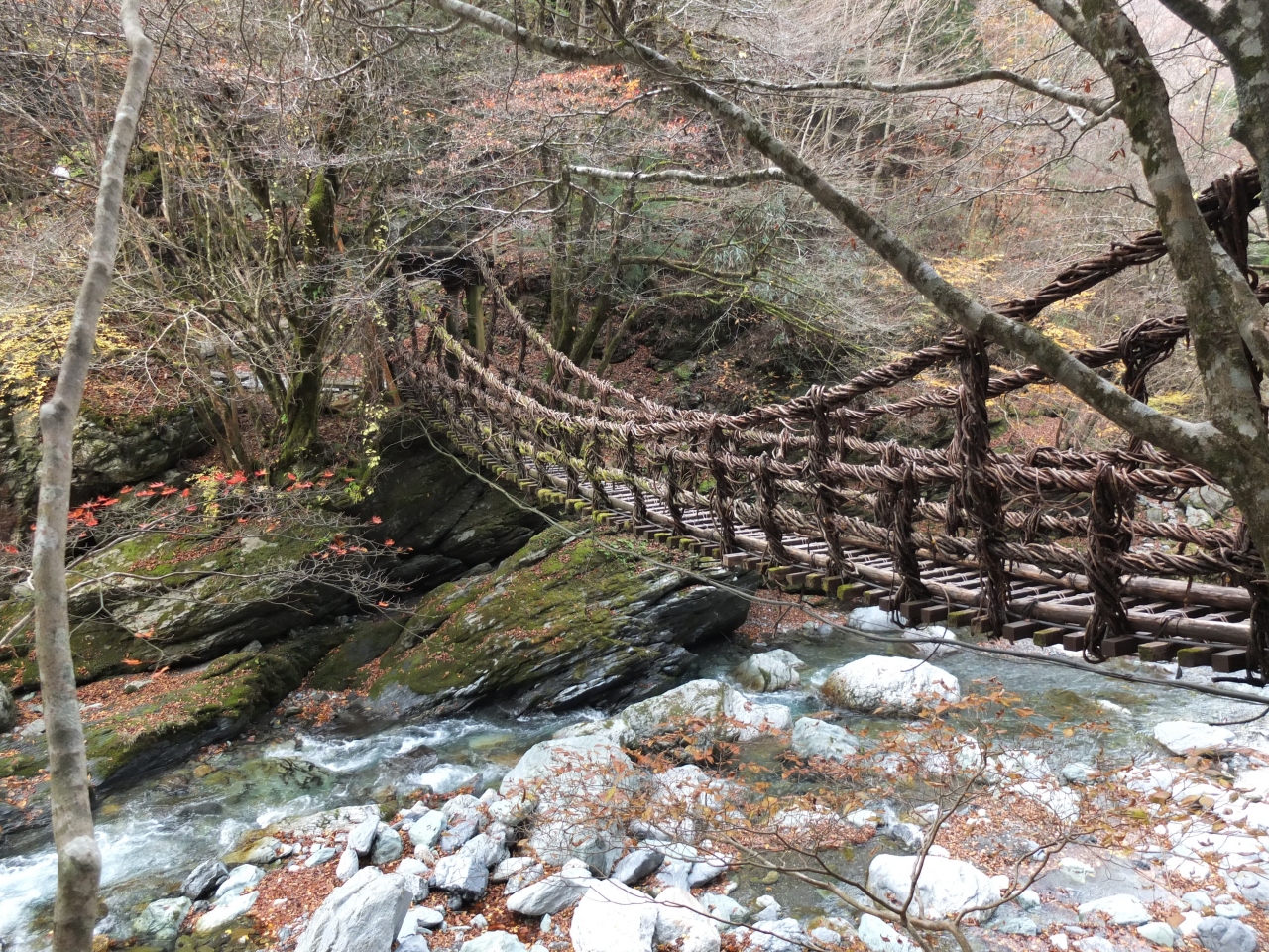 徳島の山奥にある祖谷渓谷に架かる奇橋かづら橋。木のツルで橋を形成しており、下はすかすかで恐怖感があります。一応、鉄のロープで補強してありましたので、切れる心配はありません。慣れたらスッと渡れますが、それまでは揺れと、不均一な隙間とで不安定な歩き方になると思います。珍しいので、行く価値ありです。