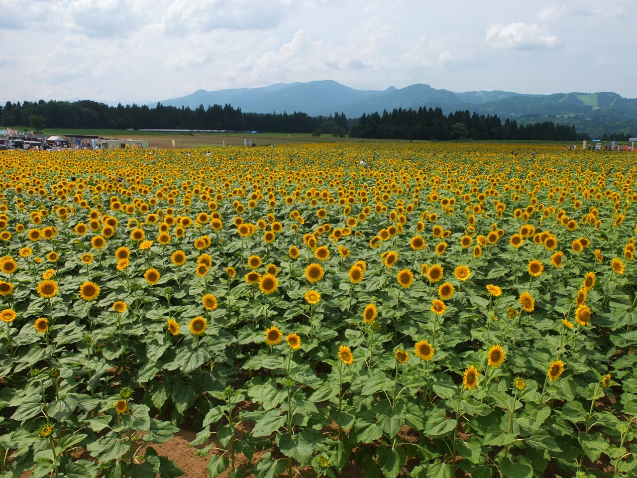 新潟県津南町にある夏季限定のひまわり広場。駐車場も大きいが、結構いっぱいになるほどの人気で、観光バスも訪れる。よって人は多い。ひまわり畑ないが中は迷路になっている箇所があり、子供たちも飽きさせない工夫がある。高台を作っており、ここから撮影すると全貌が見渡せる。一面のひまわりは圧巻だが、日陰がないため、熱中症に注意。入り口付近には露店が並ぶ。