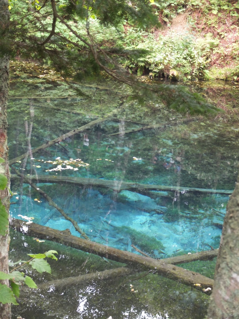 道東の摩周湖付近にある神の子池。池が吸い込まれるような青をしている箇所があります。きれいな湧水が確認でき、摩周湖の澄んだ水が来ているようです。山道を少し入った場所にあり、アクセスはあまり良くないです。トイレは最悪なので、すましてきた方が良いでしょう。