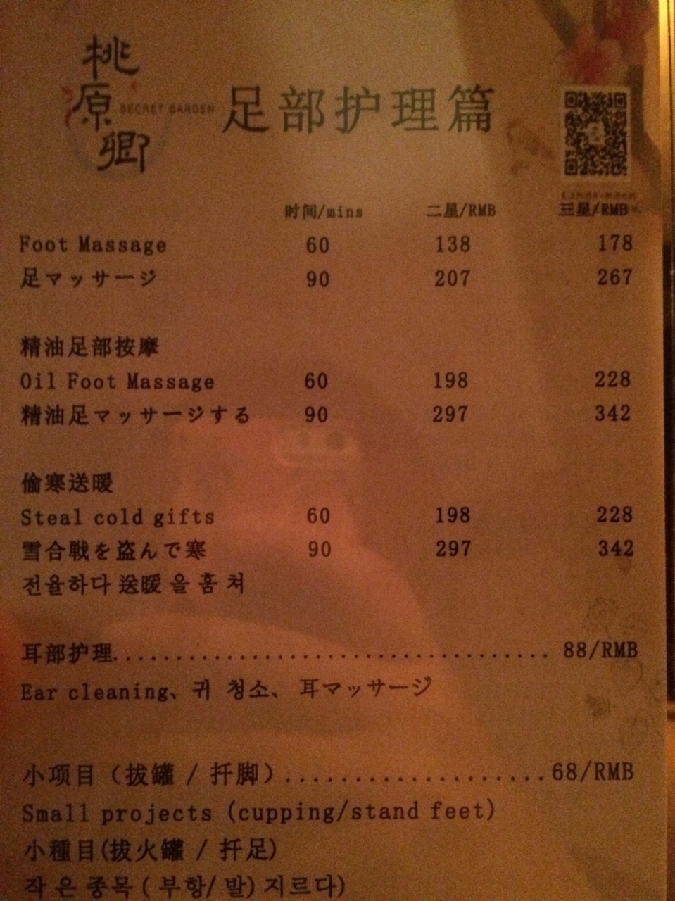 フットマッサージ60分 星2つの方で138元とありますが、2枚綴りの回数券のようなものを勧めていただき、それを使うと1回118元×2 になりました。