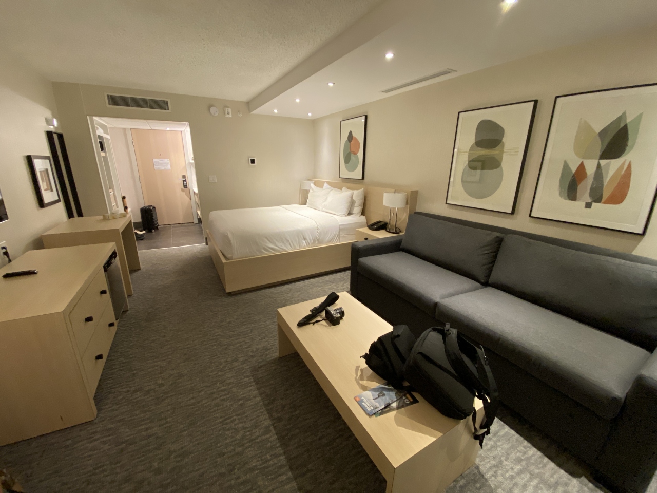 慣れていないチェックインにまごついていたら、スタッフの方に声をかけていただき、無事完了。部屋はキングルーム、シャワールーム、作業ができる机と椅子があり十分な広さ。シャワールームも含め部屋は清潔で申し分ない。- 旅行時期