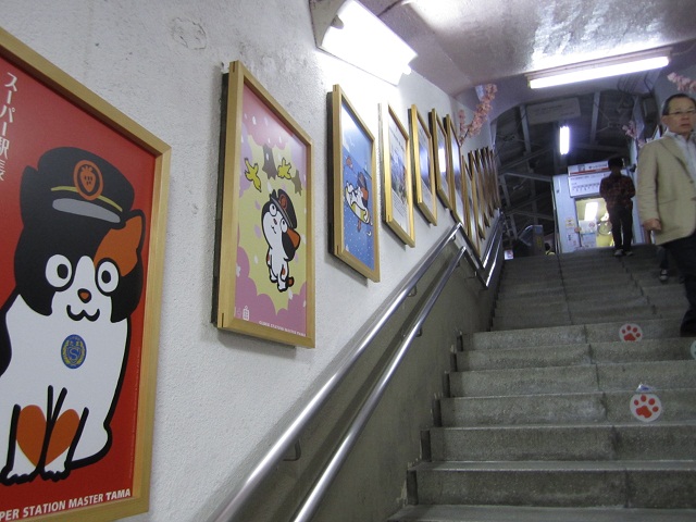 今回訪問したときは日没後だったのですが、和歌山電鐵のホーム通路に暖色系の照明が使われていたり、桜の枝(ダミーですが)が柱にさしてあったりと、そこだけが非日常空間のようでした。