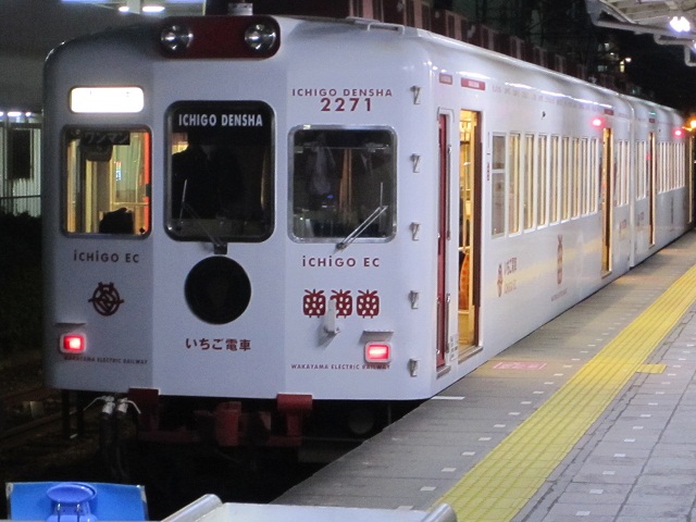 8番ホームに停車している、和歌山市駅行きの列車内で電車の出発するのを待っていましたが、隣のホームに停車している和歌山電鐵のいちご電車を眺めながら、「あー、いつか乗ってみたいなー」と思わせる雰囲気でした。- 旅行時期