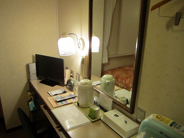 客室は、ビジネス用に適した配置で、スタンド、チェアなど最低限のデスクワークができる設備が整えられています。ベッドもまあまあゆったりしています。お風呂は貧相なユニットバスです。最近はビジネスホテルでもわりとユニットバスが大きくなっているように感じていたので、ちょっとその辺りは見劣りを感じてしまいました。
