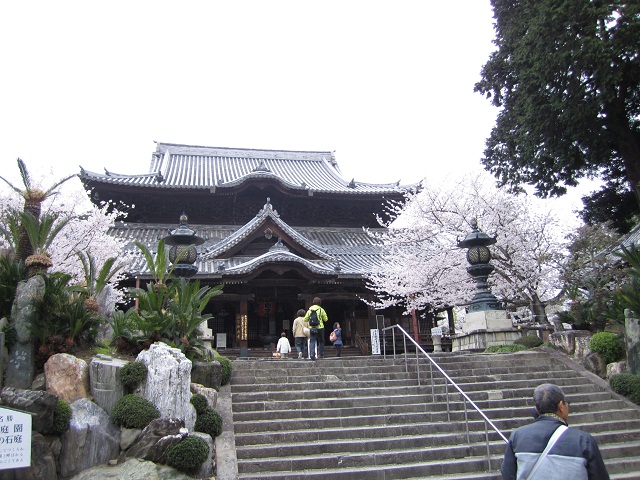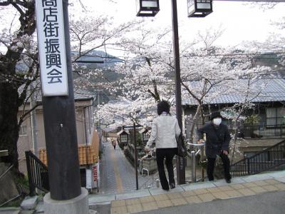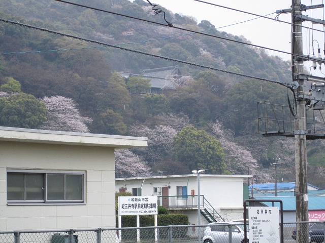 路地を歩いていくと、突き当たりに紀三井寺の山門が見えますが、思ったよりもこぢんまりとした印象です。また、今回訪問した際には、ロープが張られていて山門をくぐることはできませんでした。山門脇のプレハブ小屋にいる係りの人に入山料(200円)を払うといきなり急な上り坂が始まります。一応、石段とは別に舗装された道路も併設されていたので、足の悪い人はタクシーなどで本堂近くまで上がることも可能です(そういえば、途中で自動車も停まっていたような。山上の駐車スペースは保証の限りではありませんが)。坂道を上がって行く途中は桜が見事ですよ。